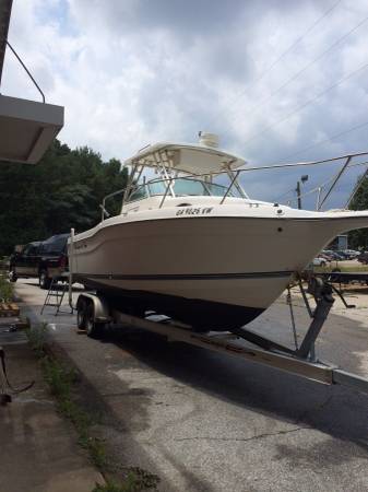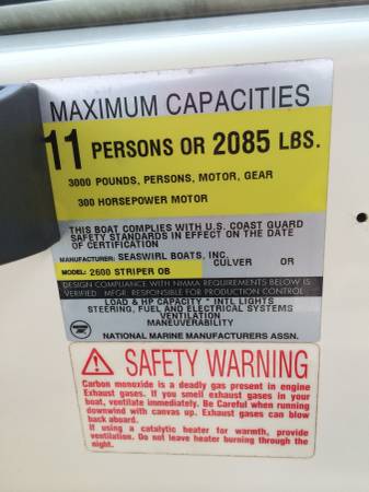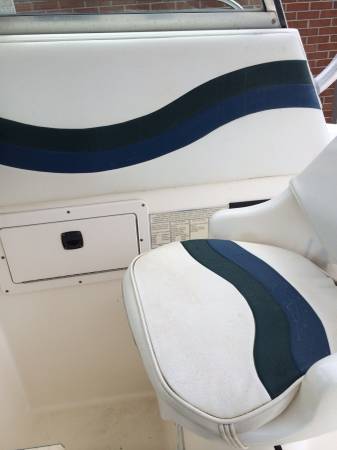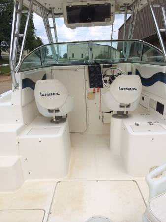 **1999 Seaswirl Striper 2600 walk around** with sleeper cabin, 2 outboard Evinrude 150 motors. Boat is 26″ long.