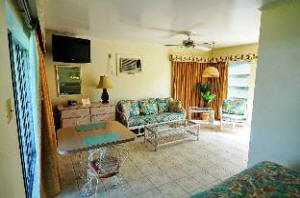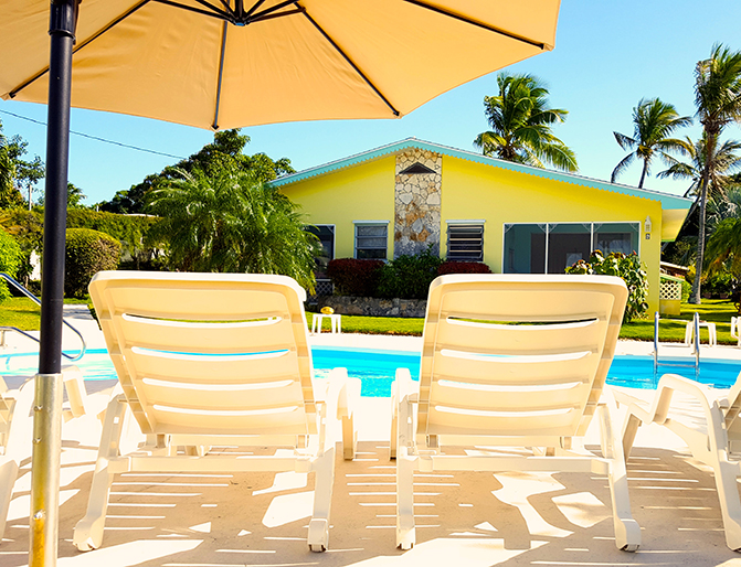 The Lofty Fig is an intimate, impeccably clean family run resort consisting of 3 single story structures surrounding a small freshwater swimming pool. Each building, brightly painted in island yellow with aqua trim, contains 2 villas.