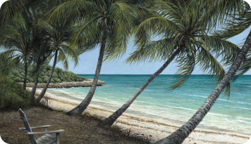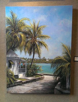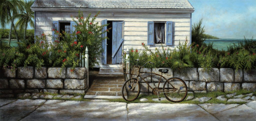 The paintings by Tripp Harrison reflect a quality of peacefulness. Tripp originally focused on the coastal areas of the United States including Pawleys Island, South Carolina and Miami’s Biscayne Bay. Working diligently, he developed a style that conveyed a kind of serenity that would become his signature in artwork. Introduced to the Bahamas in the eighties, his work began to incorporate the lush tropical foliage and the brightly colored houses dotting the landscapes of places such as Hope Town, Harbour Island and Man-O-War Cay. Tripp quite simply fell in love with the Bahamas. Like many others attracted to tropical areas, Tripp senses a calmness about the islands that calls him back time and again to gather new subject matter.