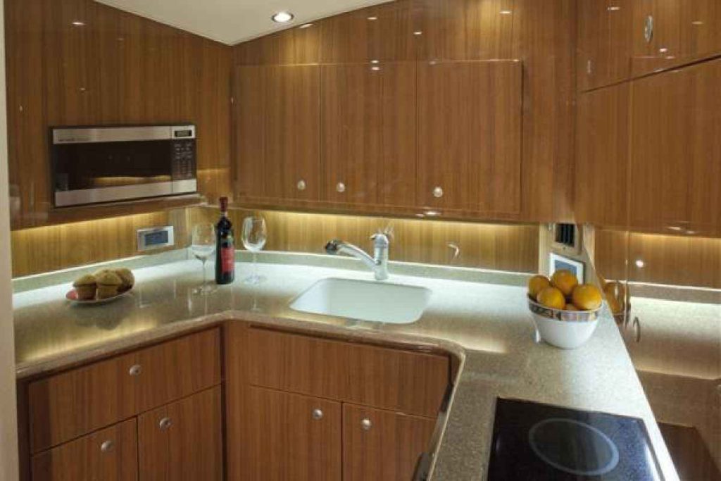 Our test vessel had the standard two-stateroom configuration, which features a master in the bow, a full head with a separate stand-up shower, a galley and a salon. The guest stateroom sits amidships, built into the space gained by the pod-drive installation. It features two side-by-side single berths and more than six feet of headroom. Viking offers the option of a third stateroom and a guest head to port, opposite the galley, with an over-under bunk. (With this setup, though, you lose the salon and a little bit of space in the master stateroom.) The galley features plenty of usable counter space, with Corian stretching along the aft bulkhead and the starboard wall. I really liked the Amtico vinyl flooring, which looks like teak but will be much easier to maintain.